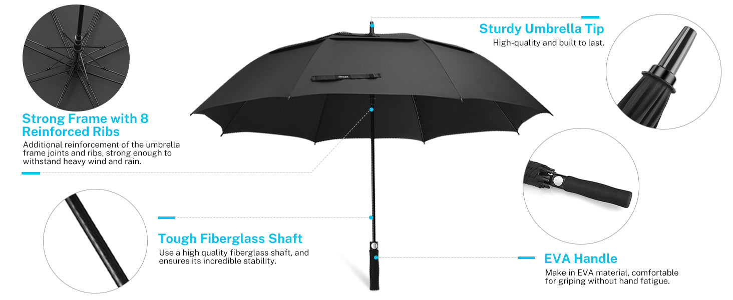 Made with water-resistant 210T Pongee fabric, a tough fiberglass shaft, and 8 reinforced ribs, this large umbrella protects you from strong rain, sun, and sleet. It also has an upgraded silver sol layer that provides strong UPF 50+ UV protection for sunny days. Its vented double canopy construction makes it wind and rainproof, providing maximum protection in harsh conditions.