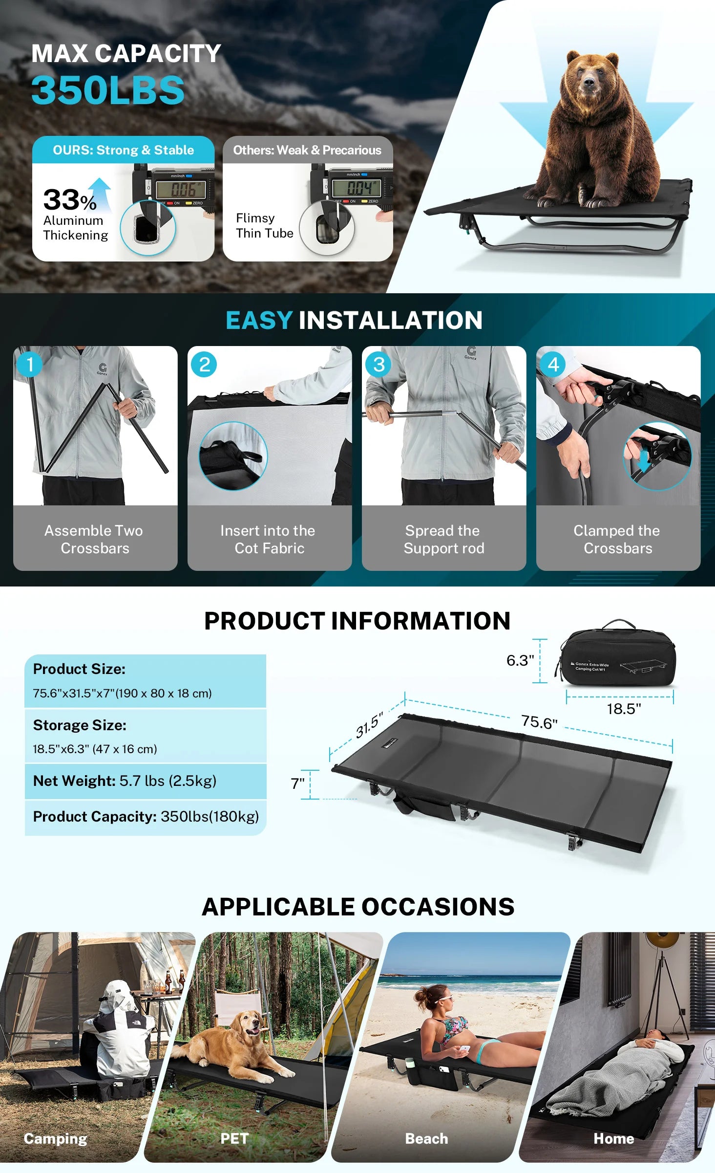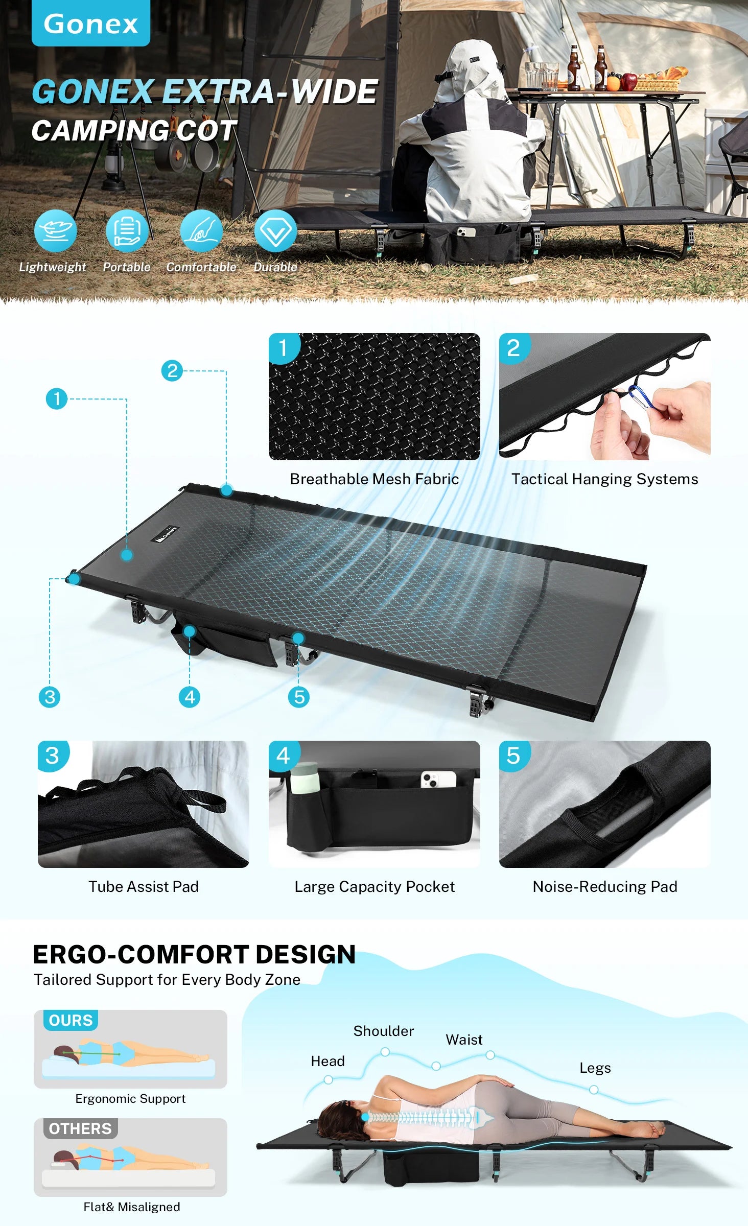 - Unmatched Durability Meets Cutting-Edge Design - The Gonex Camping Cot revolutionizes outdoor sleeping with its aerospace-grade 7075 aluminum construction, featuring a groundbreaking dual-tube design that delivers exceptional stability and supports up to 350 lbs of weight capacity.