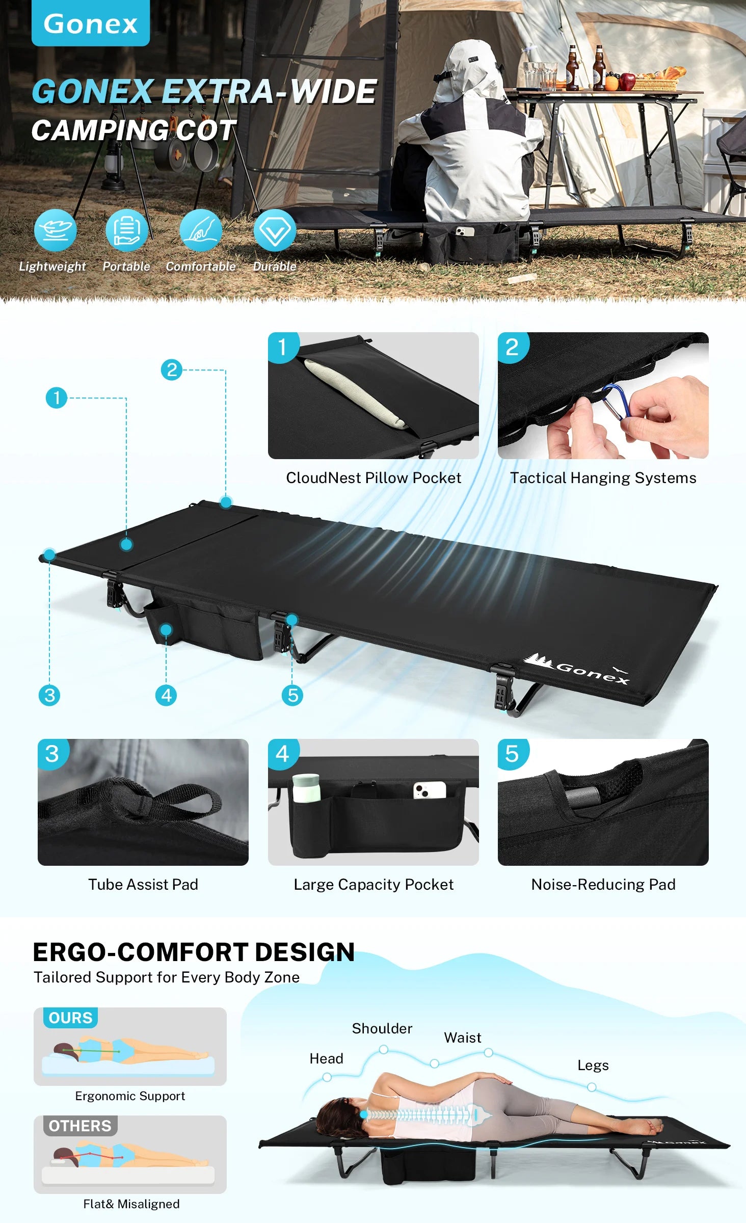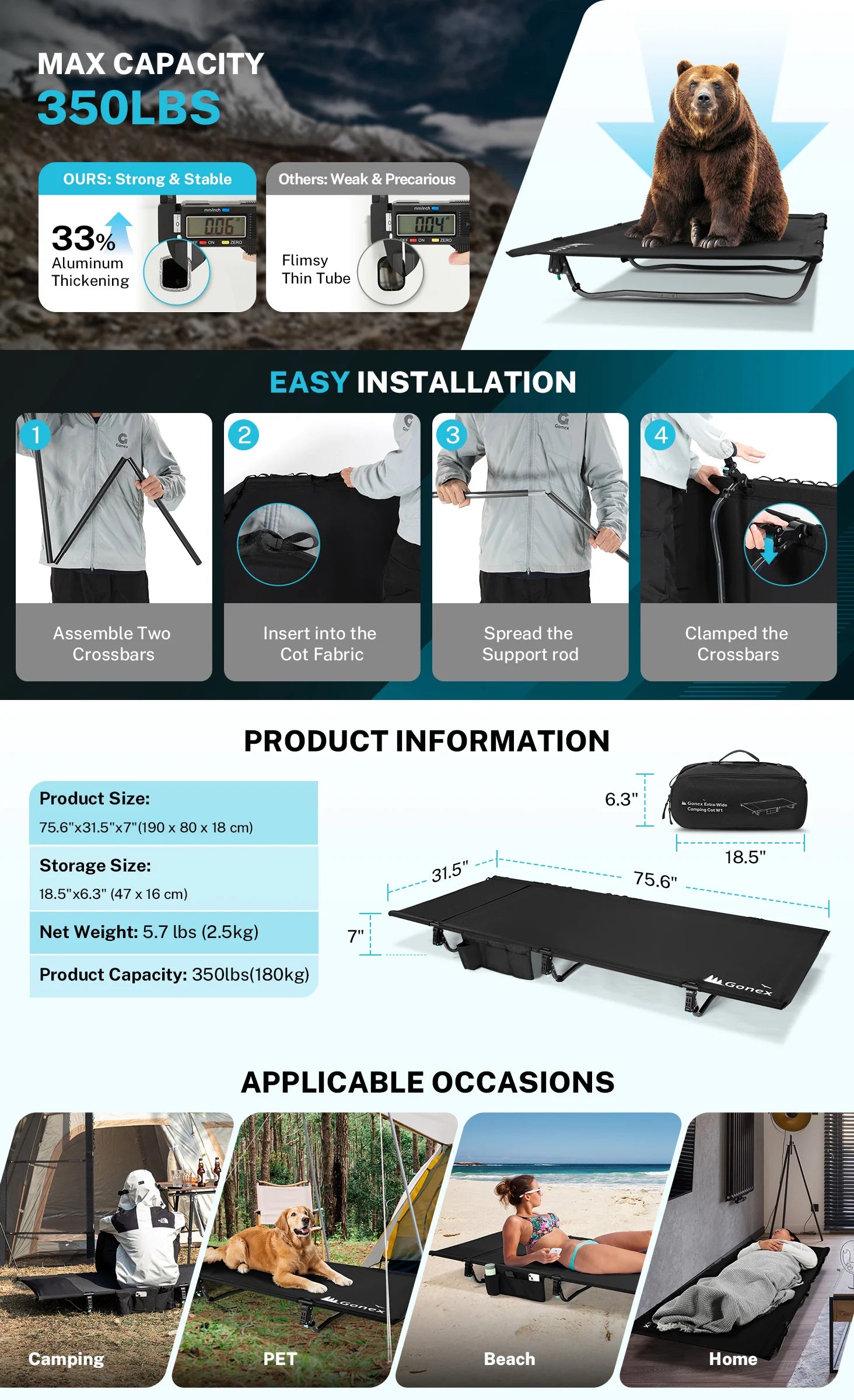 - Professional-Grade Outdoor Sleeping Solution - Crafted with cutting-edge aerospace-grade 7075 aluminum, this camping cot features an innovative dual-tube design that delivers exceptional stability and supports adventurers up to 350 lbs with unmatched structural integrity.
