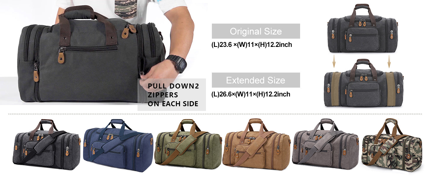Gonex 60L Canvas Duffle Bag is made of high-density cotton canvas and classical bronze tone hardware, with a soft nylon lining and smooth large zippers. Its expandable design allows you to pull down 2 side zippers to extend the bag to 26 inches long. This duffel bag can also be used as a carrying suitcase on a flight without any worries.