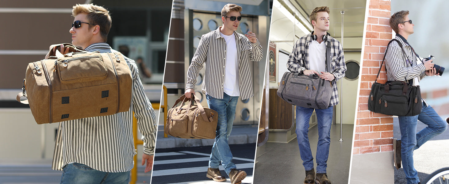 This travel duffel bag has a multi-pocket design with a 60L capacity. It has 1 large main compartment and 1 zipper pocket on the interior, 2 side zipper pockets, 2 front zipper pockets, and 1 back zipper pocket on the exterior. This canvas bag is perfect for holding a 17" laptop, iPad Pro, clothes, shoes, and other daily essentials for 5-7 days trip. With its rounded stitched grip handles, padded adjustable, removable shoulder strap, and 4 high-quality plastic cushions at the bottom, this travel bag is well resistant to dirt and wear. It is a good choice for men and women for short journeys, weekend trips, camping, sports, gym, and more.