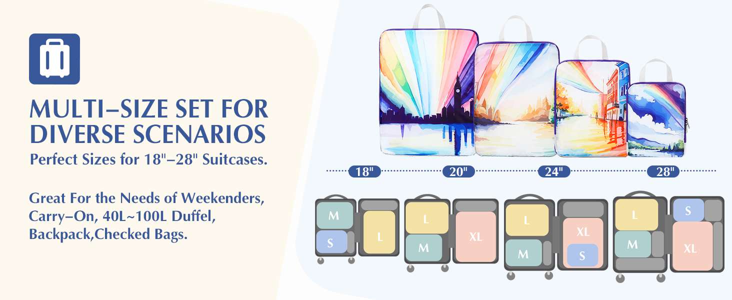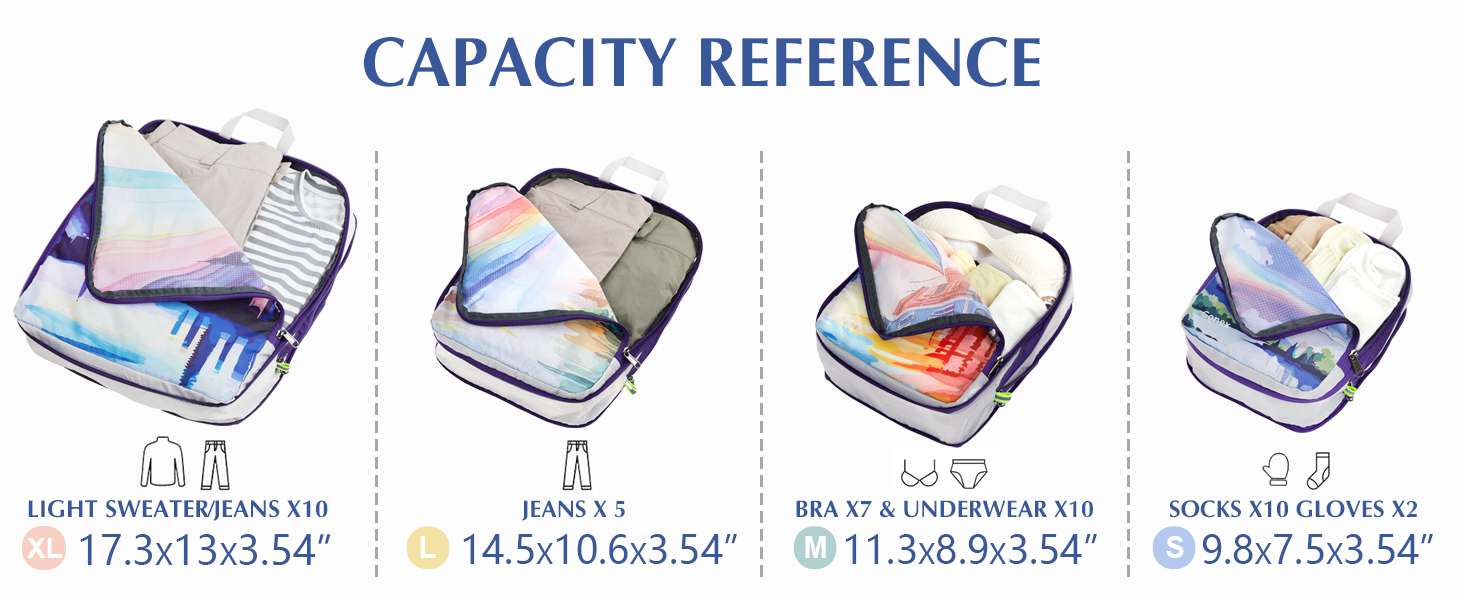 - 4 PCS SET FOR DIVERSE SCENARIOS: This set includes 4 packing cubes in different sizes to fit various luggage types. Sizes range from XL (17.3x13x3.54 inches) to S (9.8x7.5x3.54 inches).