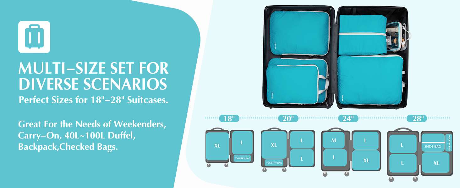 - 6-TEILIGES SET FÜR VERSCHIEDENE SZENARIEN: Dieses Set umfasst verschiedene Größen für die Anforderungen von Wochenend-, Handgepäck-, Reise-, Rucksäcken und Koffern. Es umfasst: 1 x XL: 17,3 x 13 x 3,54 Zoll, 2 x L: 14,5 x 10,6 x 3,54 Zoll, 1 x M: 11,3 x 8,9 x 3,54 Zoll, 1 x Schuhtasche: 18,1 x 13 Zoll, 1 x TSA-zugelassene transparente Kulturtasche: 7,75 x 6 x 2,75 Zoll.