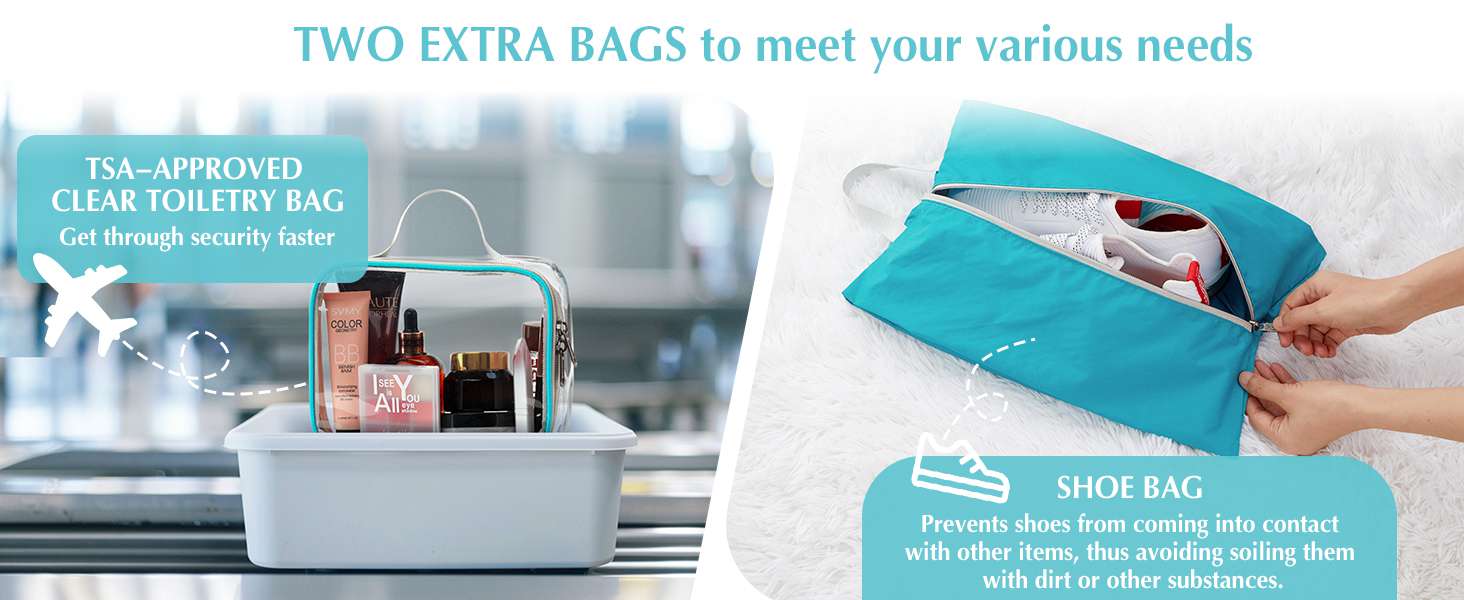 - Halten Sie Ihre Gegenstände sauber und ordentlich: Das Set enthält einen Schuhbeutel, der verhindert, dass Schuhe andere Gegenstände verschmutzen. Der von der TSA zugelassene transparente Kulturbeutel ermöglicht eine schnellere Durchquerung der Sicherheitskontrolle.