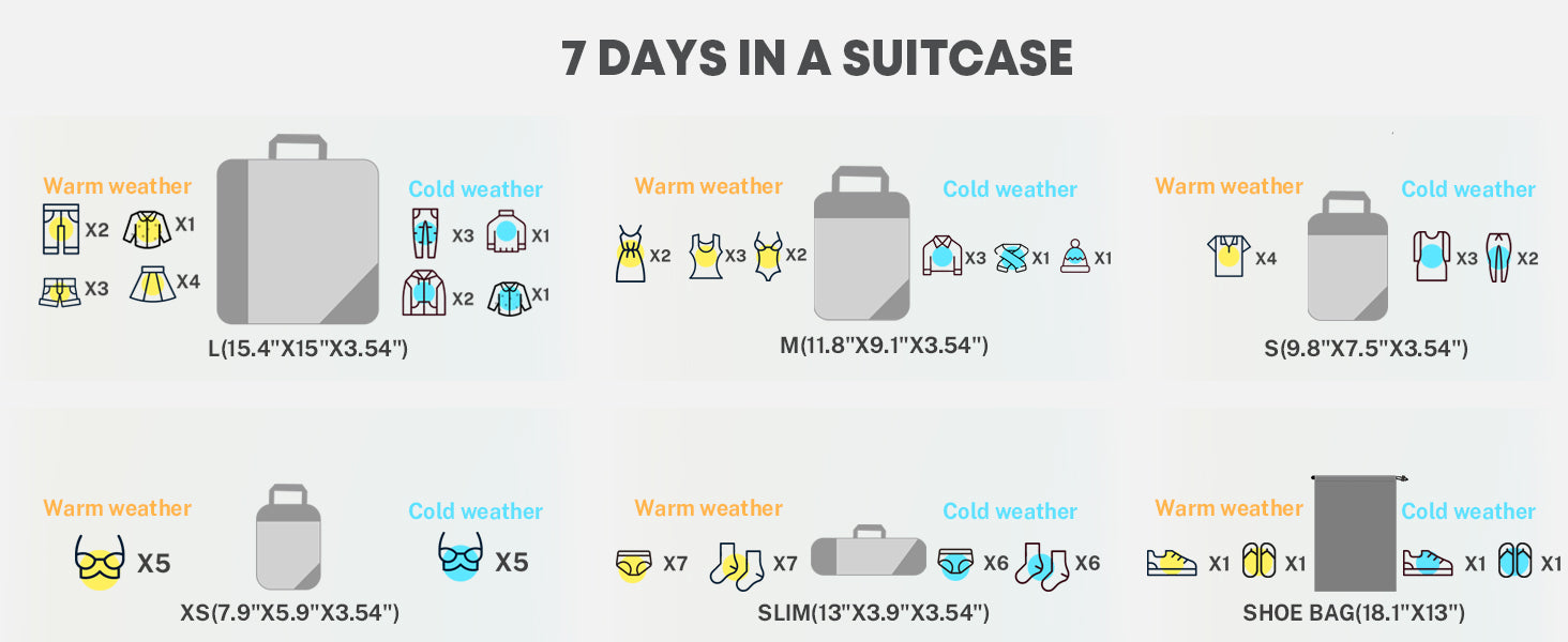 Dieses praktische Set sortiert und organisiert Ihre Kleidung, BHs und Unterwäsche, Handtücher und schmutzige Kleidung gut und hinterlässt ein aufgeräumtes und ordentliches Gepäck. Es verdichtet Ihre Kleidung und spart zusätzlich 50 % Platz, wenn der Reißverschluss geschlossen ist. Es passt gut in einen Koffer und eignet sich für Geschäftsreisen, Familienurlaube, Camping, Wandern, Sport, Fitnessstudio, Strand usw. Es ist ideal für Familienurlaube und Geschäftsreisen , Outdoor-Camping und tägliche Lagerung.