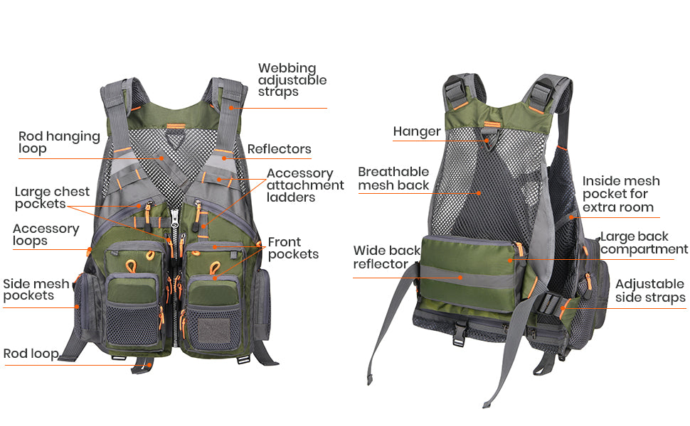 Mehrere Taschen: Halten Sie Ihre Angelutensilien organisiert mit der Gonex Fliegenfischerweste, die über 2 große Reißverschlusstaschen und 2 Netztaschen verfügt. Es ist der perfekte Begleiter für die Aufbewahrung von Angelschnüren, Ködersets und verschiedenen Werkzeugen.