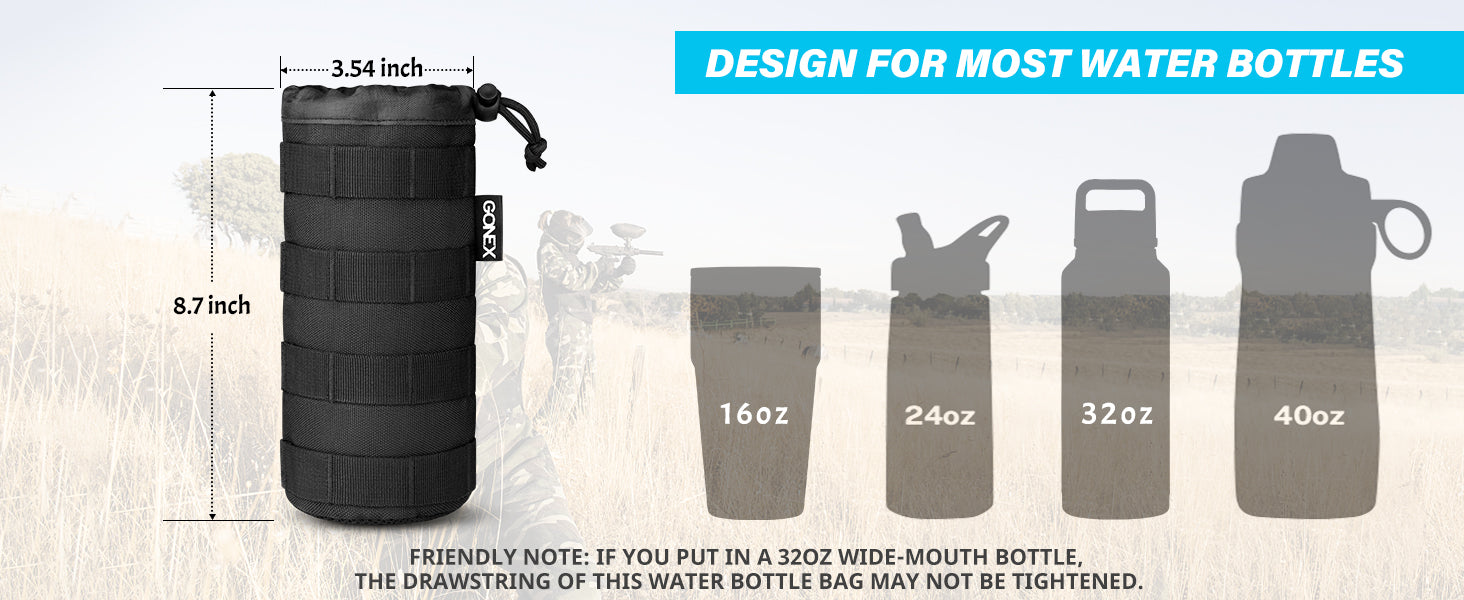 Die Gonex Tactical Military MOLLE-Wasserflaschentasche bietet Platz für verschiedene Größen von Wasserflaschen. Kunden haben es erfolgreich zur Aufnahme von Wasserflaschen mit einem Durchmesser von etwa 3,5 Zoll verwendet, beispielsweise für eine 36-Unzen-Yeti-Rambler-Flasche und eine 500-ml- oder möglicherweise 750-ml-Flasche. Der Beutel verfügt über einen Kordelzugverschluss, der festgezogen werden kann, um kleinere Flaschen sicher aufzubewahren.