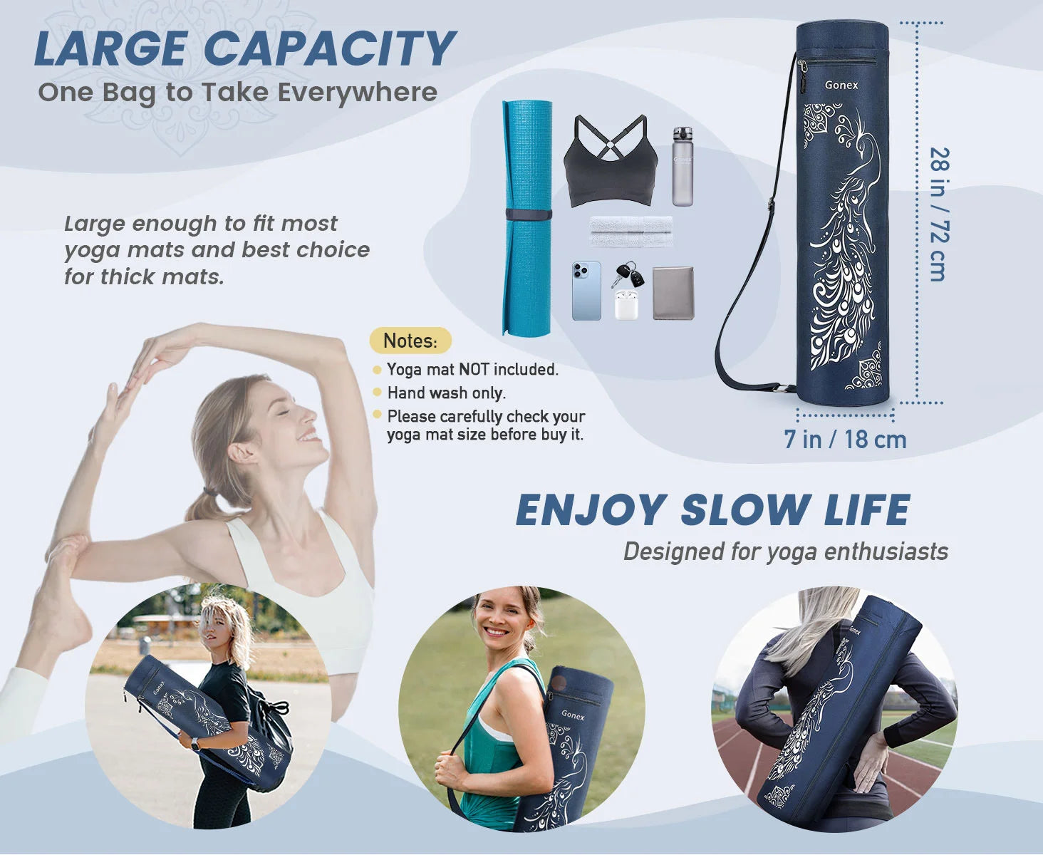 - Entdecken Sie die hochwertige Gonex Yogamattentasche mit atemberaubendem Pfauenmuster, fachmännisch gefertigt aus robustem 600D Oxford-Stoff mit 210D verstärkten Nähten. Dieses wasserabweisende Design gepaart mit glatten SBS-Reißverschlüssen sorgt dafür, dass Ihre Yogautensilien während unzähliger Übungseinheiten geschützt bleiben.